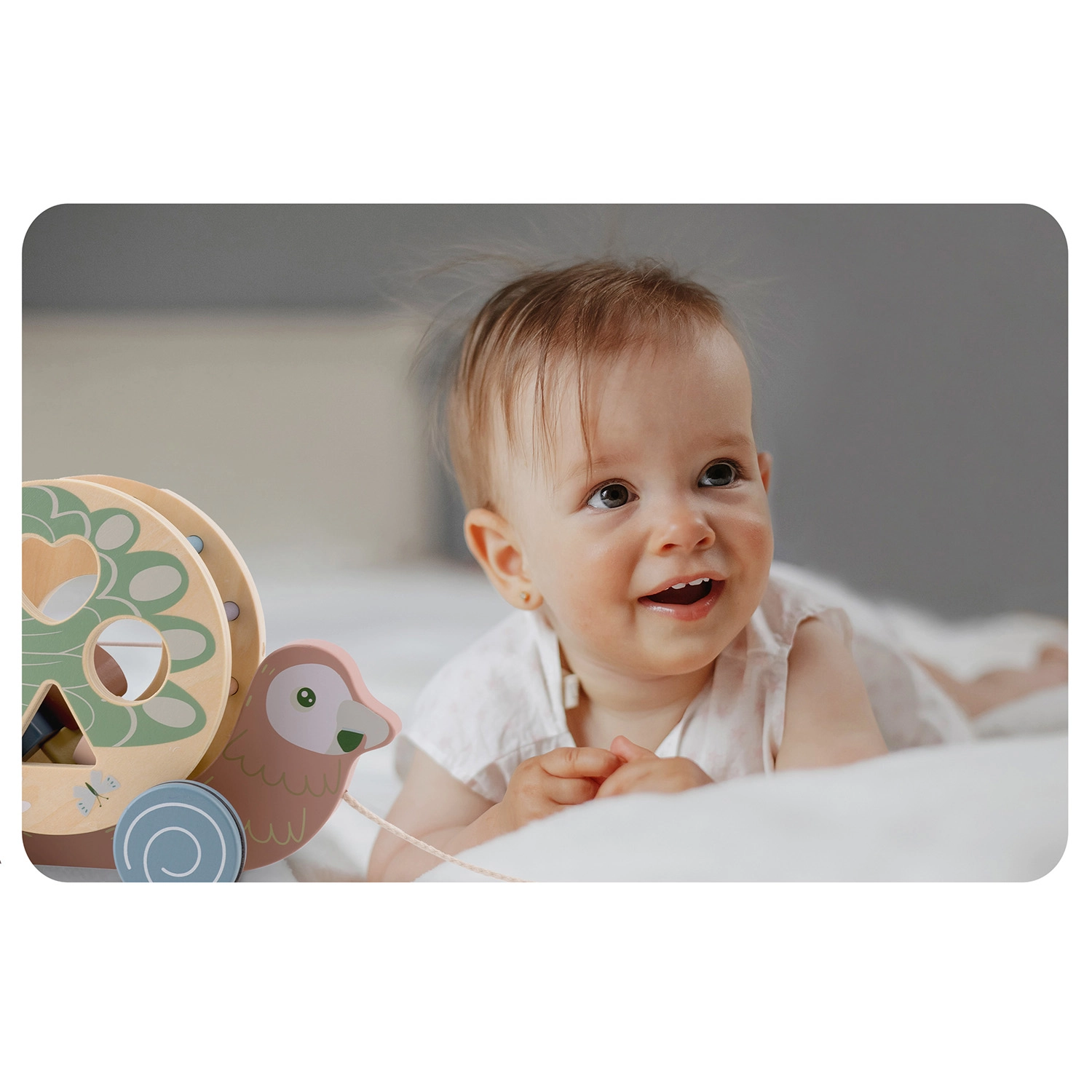 Il cordino robusto e le ruote che scorrono senza sforzo favoriscono il cammino, l’equilibrio e un’esplorazione sicura dello spazio.
