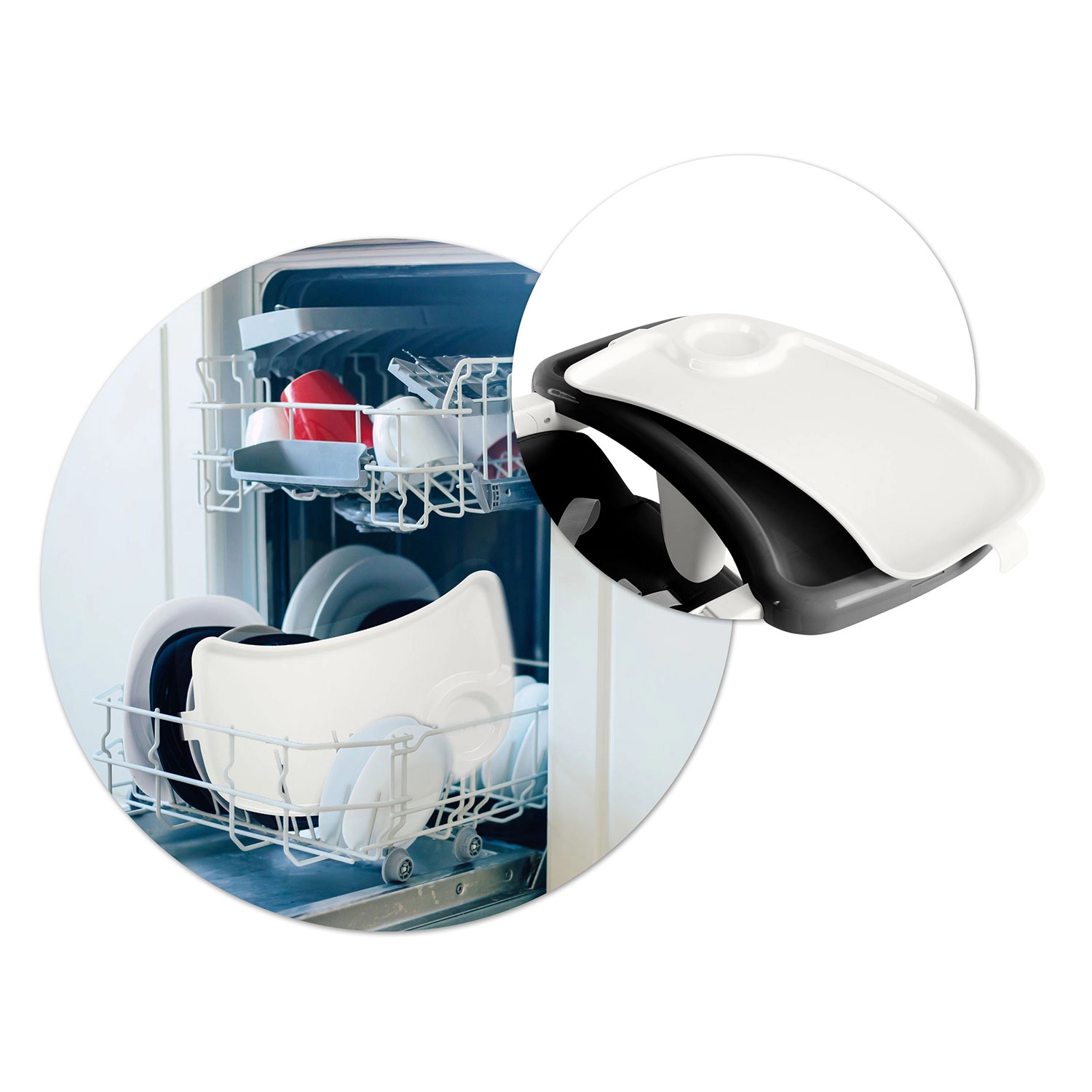 L’inserto superiore del vassoio può essere rimosso e risciacquato; il rivestimento non assorbe lo sporco – basta una passata e il seggiolone torna pulito in un attimo.