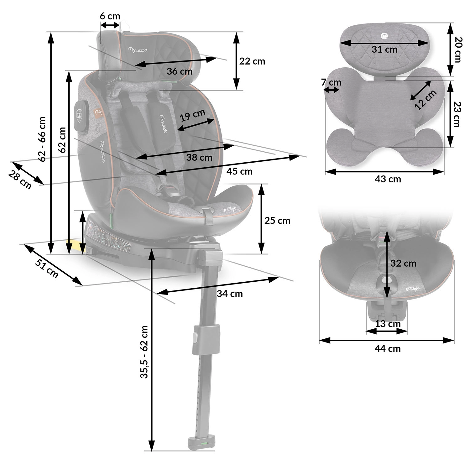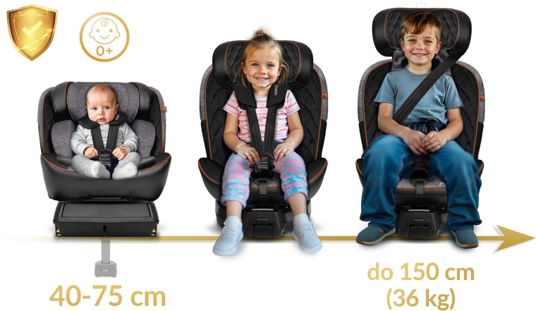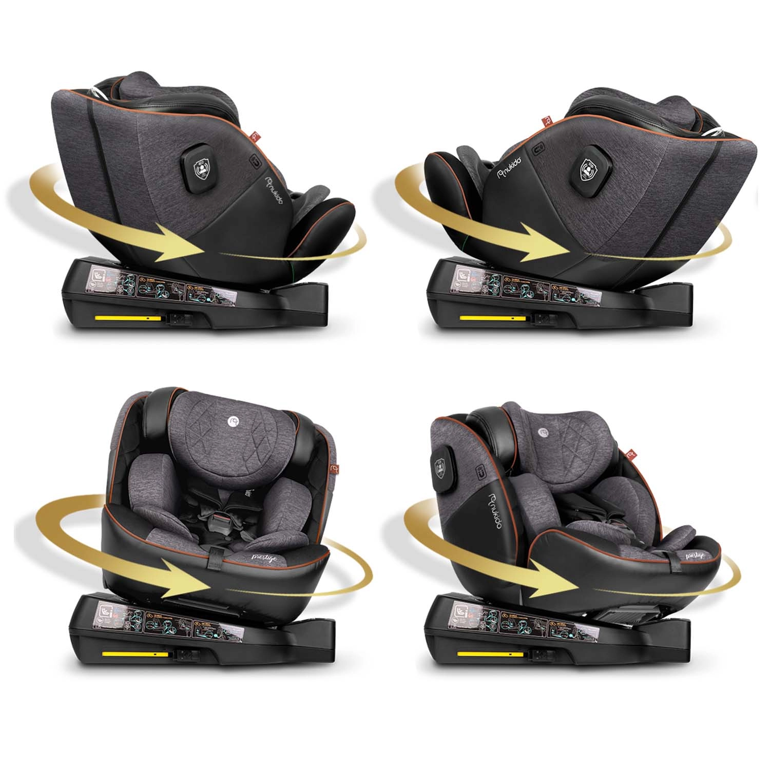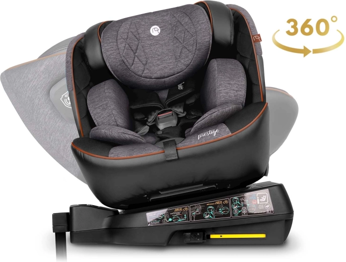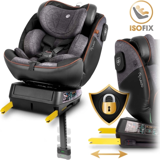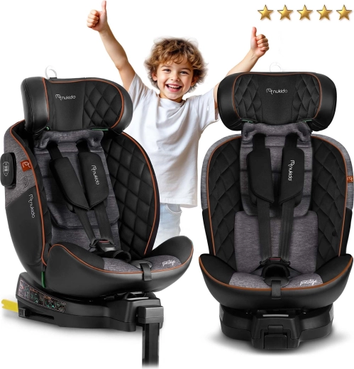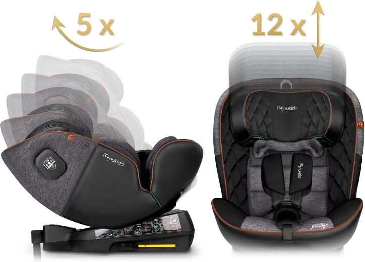 Il seggiolino auto Nukido Prestige Line è progettato secondo la norma ECE R129 i-Size per un’altezza di 40–150 cm e accompagna il bambino dalla nascita fino a circa 12 anni. Grazie alla base girevole a 360° puoi allacciare facilmente il bambino di lato alla portiera per poi fissare il seggiolino nella posizione desiderata. La SIP – Side Impact Protection con sponde rinforzate protegge testa, collo e colonna vertebrale in caso di impatto laterale, mentre ISOFIX e gamba di supporto garantiscono un fissaggio solido e rapido.