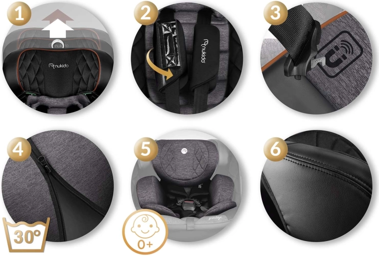 Per i più piccoli è previsto il cinturino di sicurezza a 5 punti e l’ergonomico inserto per neonati. Per i bambini più grandi il seggiolino offre il passaggio della cintura dell’auto tramite 4 punti di ancoraggio e l’adattamento alla crescita grazie a 12 livelli di regolazione del poggiatesta e 5 livelli di inclinazione. Materiali premium, imbottitura morbida trapuntata e dettagli intelligenti (magneti per tenere fermi i cinturini, coperture antiscivolo) aumentano comfort e praticità d’uso quotidiana.