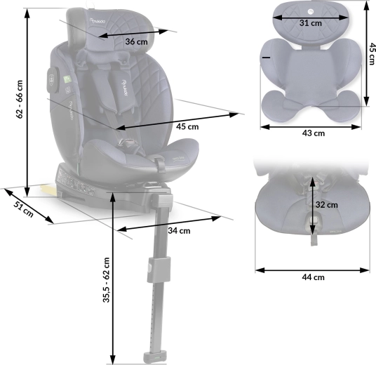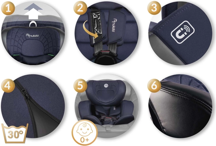 Il seggiolino auto girevole Nukido Aero Line per altezza 40–150 cm (i-Size) offre la rotazione a 360° per sistemare facilmente il bambino, ISOFIX con gamba di supporto per la massima stabilità e protezione laterale SIP per la sicurezza in caso di impatto. Dispone di 5 posizioni di reclino, 12 livelli di regolazione del poggiatesta, morbida imbottitura e rivestimento lavabile: comfort e sicurezza per molti anni.