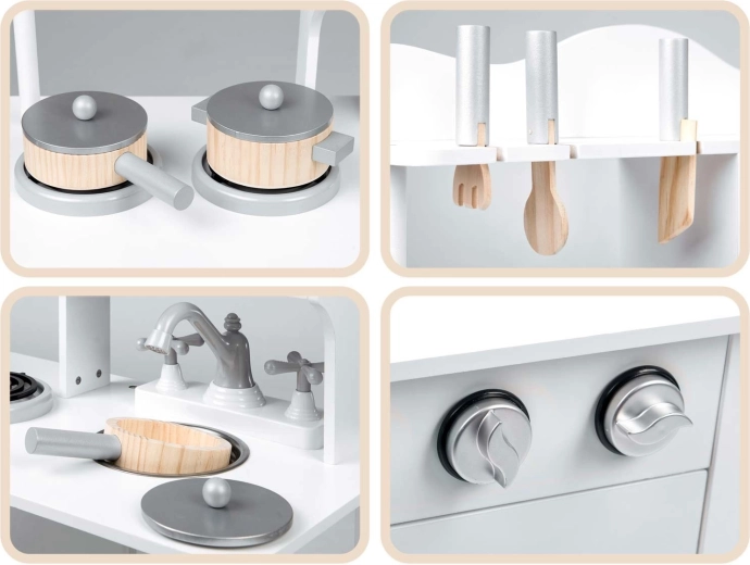 Grazie al lavello estraibile, la manutenzione e il gioco con l’acqua sono facili e divertenti, mentre le ante magnetiche e i bordi arrotondati aumentano la sicurezza. Le pratiche mensole e ganci offrono molto spazio per riporre gli accessori. La cucina è realizzata con cura dei dettagli e rispetta le norme di sicurezza EN.