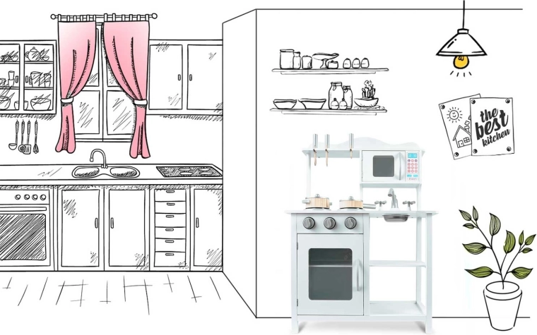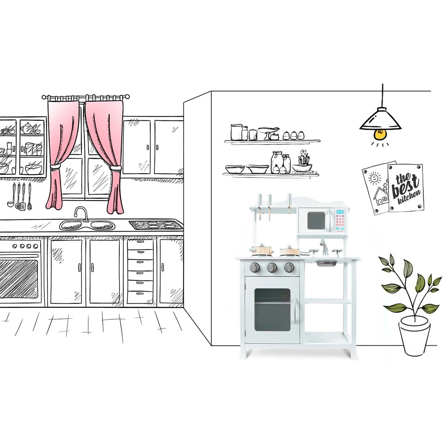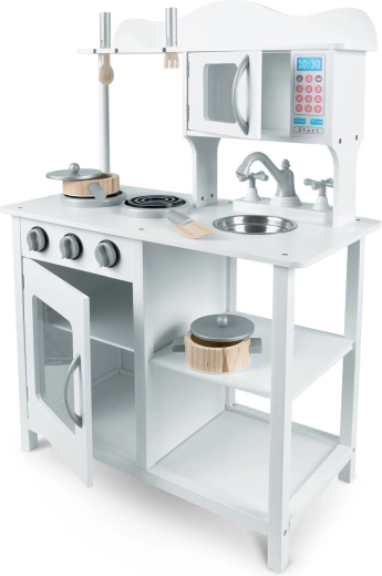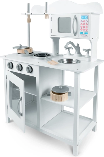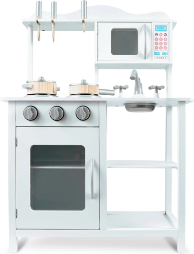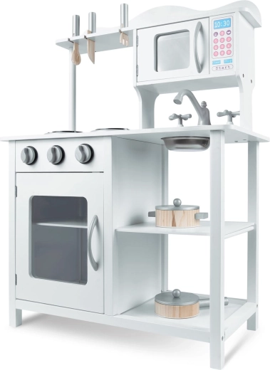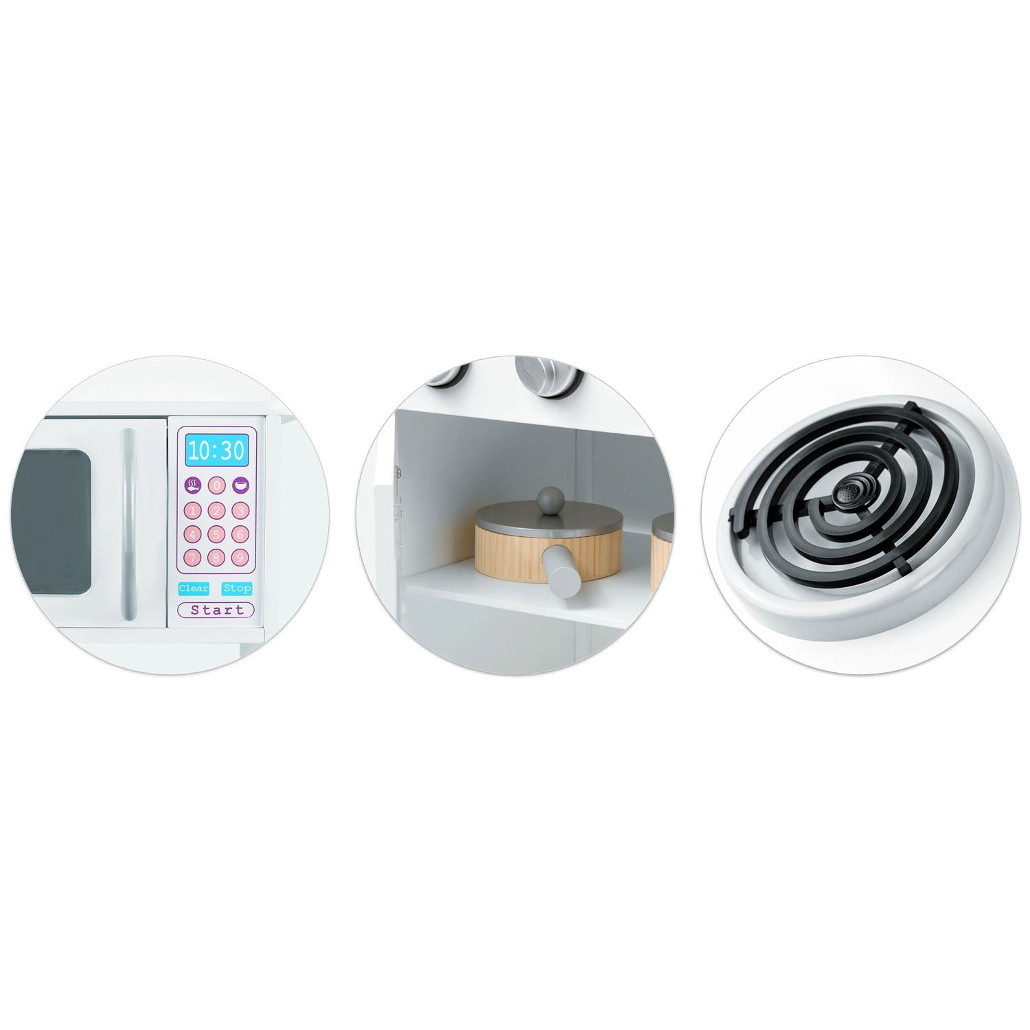 Questa cucina in legno dal design elegante e nel versatile colore bianco si adatta perfettamente a ogni cameretta. Elementi realistici come i fornelli con manopole girevoli, il forno a microonde con pannello colorato e il forno con ripiano incoraggiano il gioco imitativo e insegnano ai bambini le basi della cucina e dell’organizzazione.