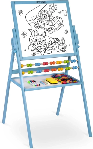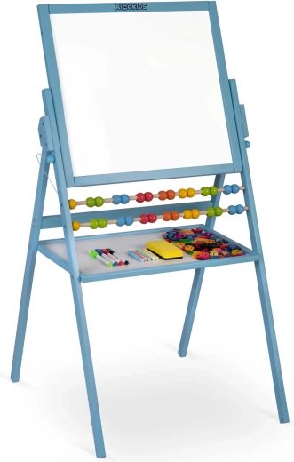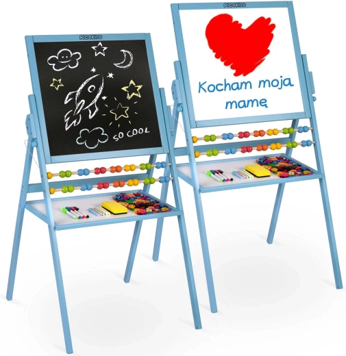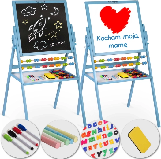 La grande lavagna multifunzione per bambini del marchio RICOKIDS unisce il lato a gesso e quello bianco magnetico in un unico telaio girevole. Grazie alla solida struttura in legno, all’abaco integrato e al ricco set di accessori (gessetti, pennarelli, spugnetta, lettere e numeri magnetici) stimola creatività, apprendimento e divertimento – il tutto in sicurezza e con certificazioni CE, EN 71.