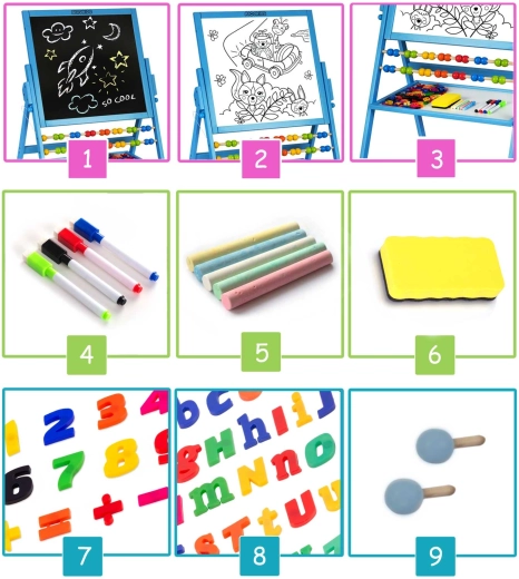 È inclusa un’abaco colorato che sviluppa la logica e aiuta con i primi esercizi di calcolo in modo divertente. Il ricco set di accessori – pennarelli, gessetti, spugnetta, lettere e numeri magnetici – consente gioco e apprendimento immediati senza ulteriori acquisti.