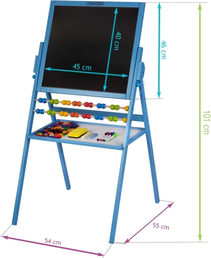 La struttura girevole combina la lavagna a gesso per disegni creativi e la lavagna bianca magnetica per scrivere con pennarelli cancellabili e lavorare con lettere e numeri magnetici.