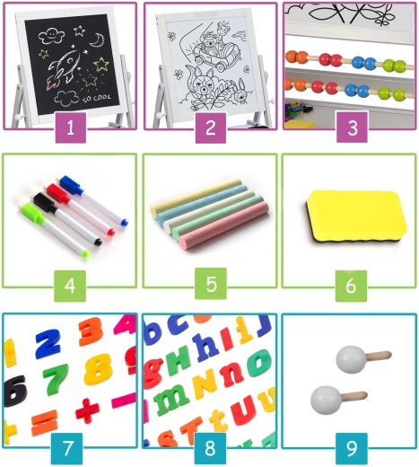 - Abaco, pennarelli cancellabili, gessetti colorati, spugnetta, numeri e lettere magnetiche, elementi di montaggio