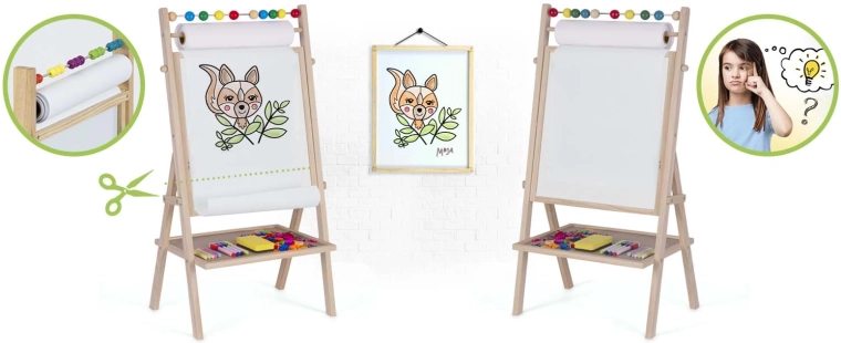 Il supporto integrato con rotolo di carta da 20 metri incoraggia il disegno e la pittura. Le ricariche sono facilmente reperibili.