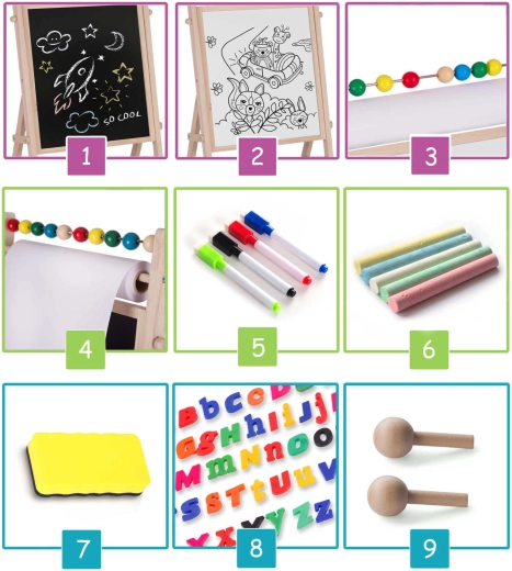 - Dotazione completa: pennarelli cancellabili, gessetti colorati, spugnetta, lettere e numeri magnetici