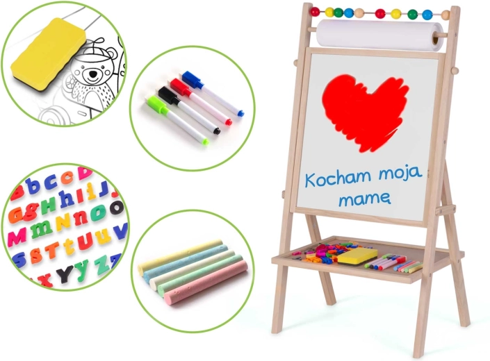 Scopri il centro creativo per piccoli artisti e scolari: la stabile lavagna in legno RICOKIDS combina superficie bianca magnetica e lavagna a gesso in un unico prodotto, completata da un rotolo di carta da 20 m, un abaco e un ricco set di accessori per imparare divertendosi.