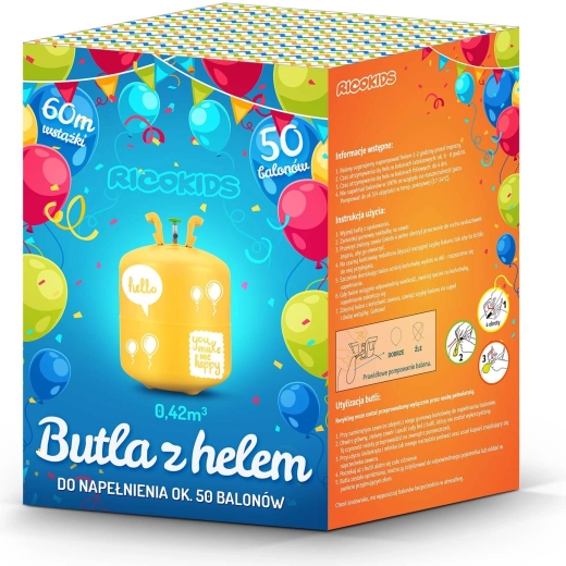 - Bombola di elio, 50 palloncini colorati, 60 m di nastro decorativo, confezione regalo, manuale e avvertenze (PL)