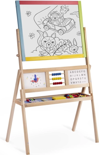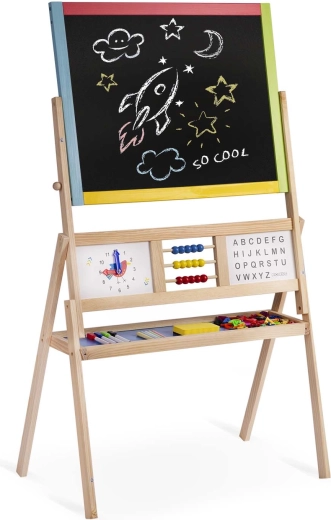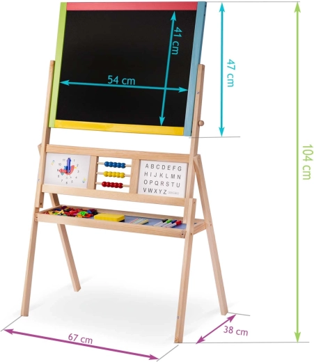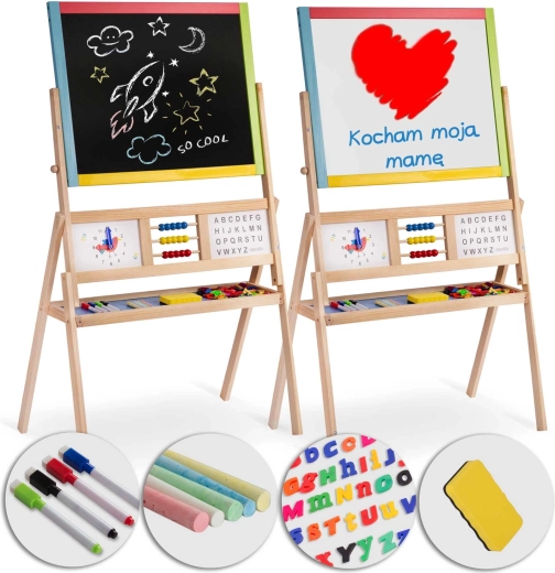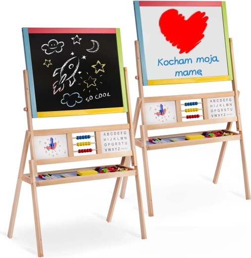 Scopri la grande lavagna bifacciale per bambini del marchio Ricokids, che combina in un unico prodotto superficie a gesso e magnetica. Struttura stabile, pannello girevole, orologio didattico, abaco e un ricco set di accessori la rendono lo strumento ideale per apprendimento e divertimento creativo.