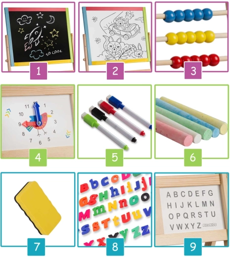 Due lavagne in una per la massima creatività e sviluppo: il lato magnetico consente di scrivere con pennarello cancellabile e di applicare lettere e numeri magnetici, mentre il lato a gesso invita a disegnare e scrivere con i gessetti. Il meccanismo girevole facilita il rapido cambio di superficie e un gioco fluido.
