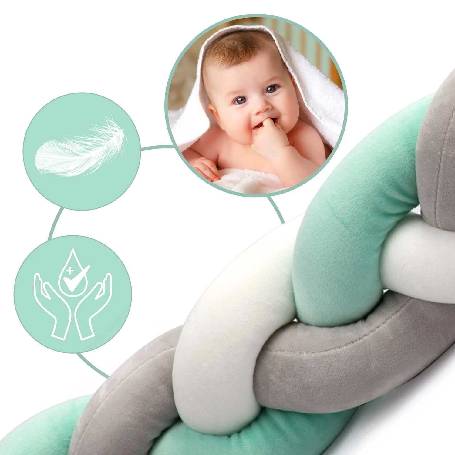 Il paracolpi intrecciato per lettino Ricokids, lungo 2 m e alto circa 11,5 cm, crea una morbida barriera protettiva intorno al bebè. Il tessuto soffice è piacevole al tatto, antiallergico e privo di parti taglienti, quindi adatto fin dalla nascita. La moderna combinazione di menta, grigio e bianco dona all’ambiente un delicato tocco scandinavo.