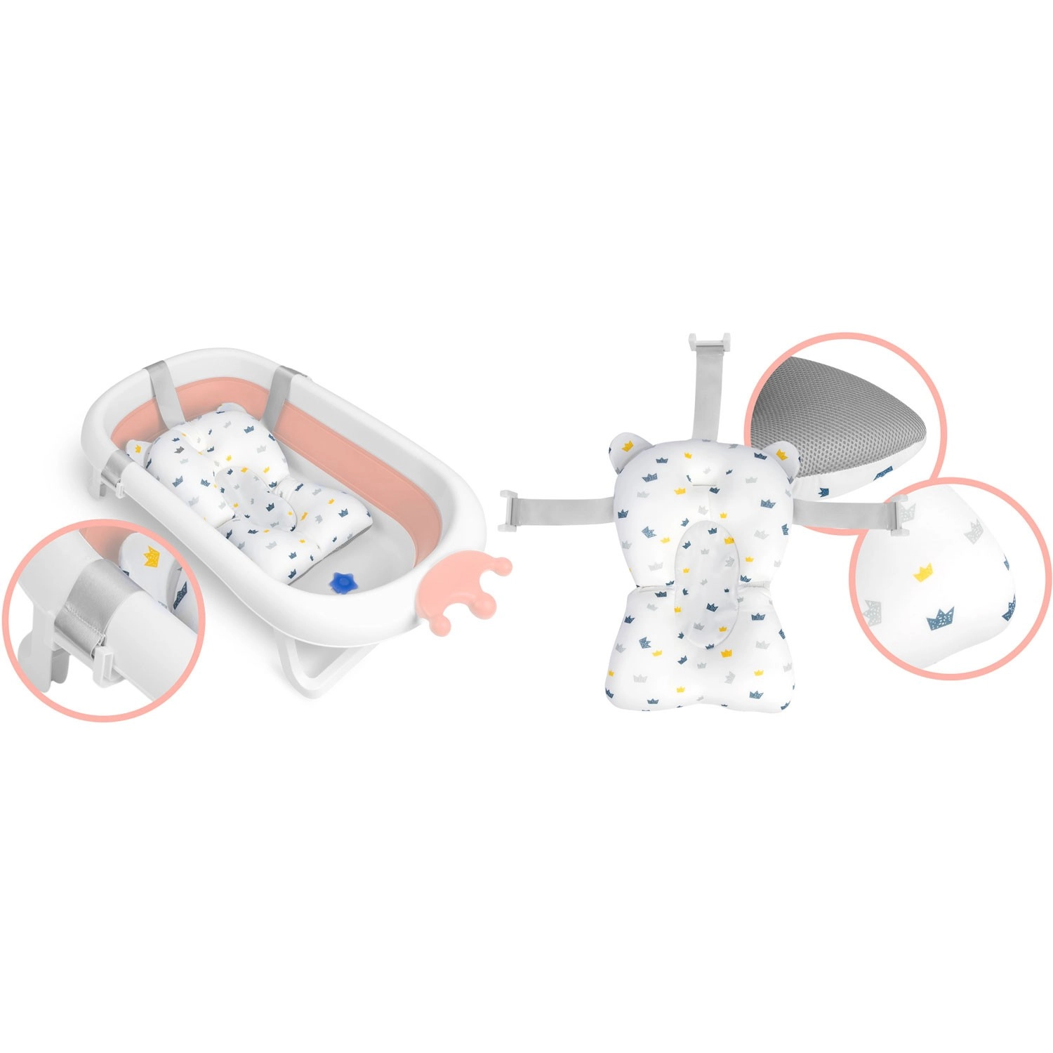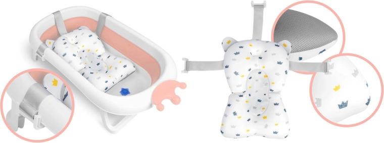Pratica vaschetta da viaggio per neonati e bimbi piccoli che unisce struttura pieghevole, leggerezza e massima sicurezza. Dispone di piedini e seduta antiscivolo, tappo termico che cambia colore oltre i 38 °C e morbido cuscino removibile fissato con cinghie. Ideale per l’uso quotidiano e in viaggio, con tappo di scarico per svuotare l’acqua con facilità.