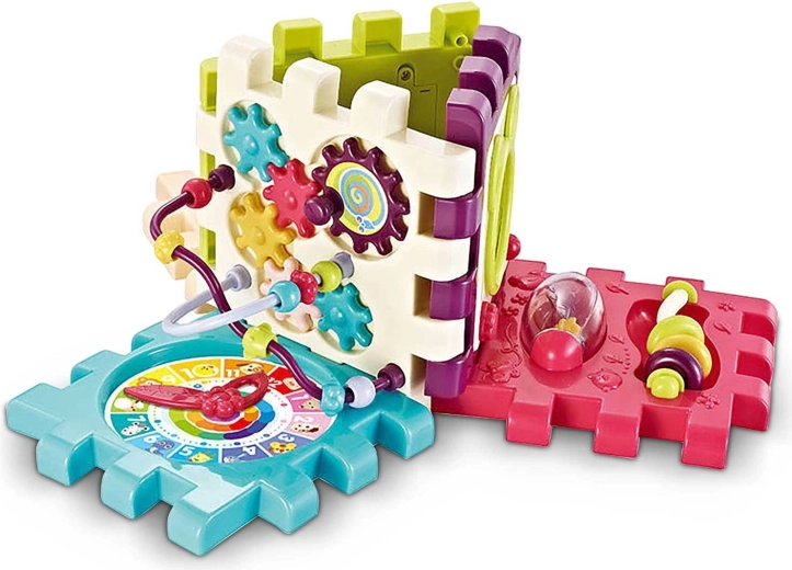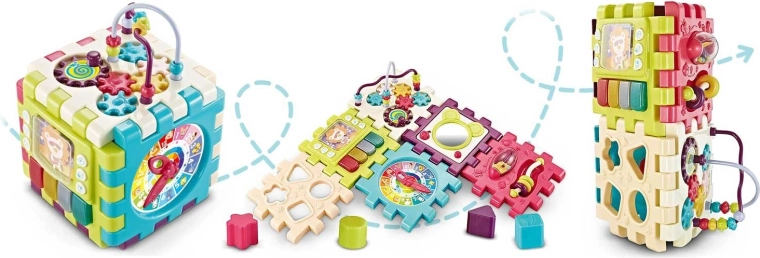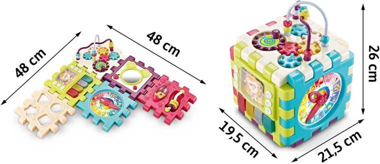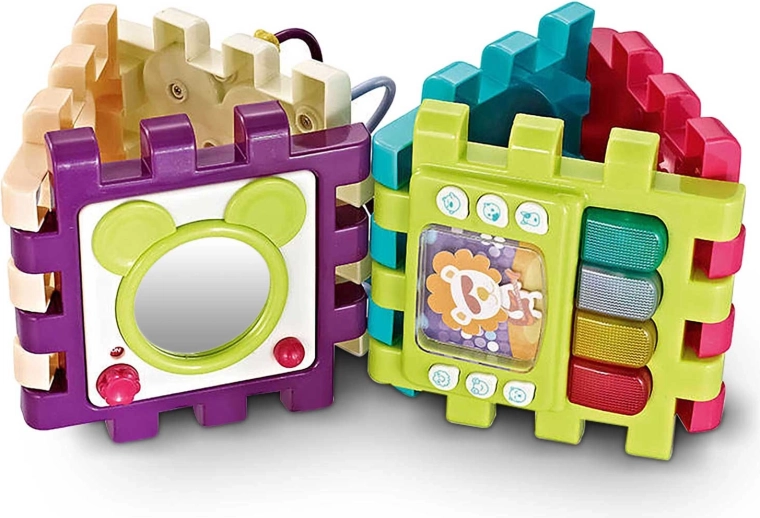 Ogni segmento può essere usato come placca attiva indipendente oppure assemblato liberamente in un cubo, una torre o percorsi con attività. Il cubo cresce con il bambino, sviluppa il pensiero logico, la coordinazione mano-occhio e favorisce le prime espressioni in inglese. Grazie alla plastica di qualità, il giocattolo è resistente e facile da pulire e rispetta la normativa di sicurezza EN71.