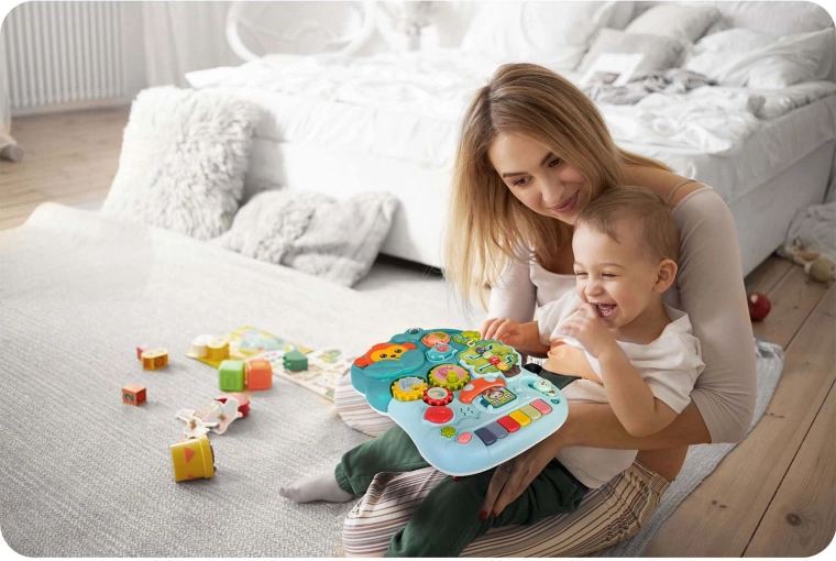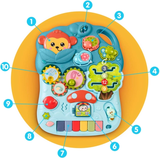 Il pannello rimovibile è ricco di attività: pianolino colorato, pioli, ingranaggi, pulsanti con canzoncine e suoni percussivi, labirinto con fili, abbinamento forme, elementi sensoriali e altro ancora. Il bambino scopre in modo divertente colori, forme e numeri e sviluppa motricità fine e coordinazione mano-occhio.
