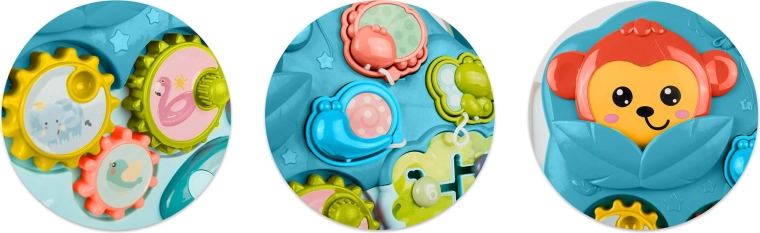 Pulsanti, ingranaggi, cursori, labirinto e tasti colorati favoriscono l’apprendimento di colori, forme e numeri e sviluppano la motricità fine e i sensi.