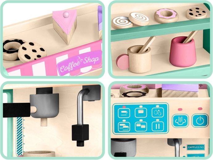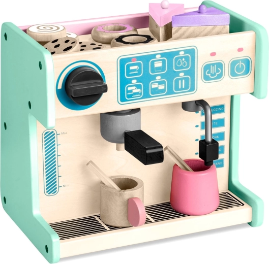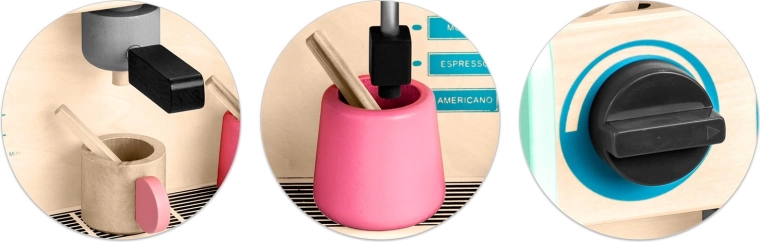 Dettagli curati come portafiltro, manopole girevoli, lancia vapore, tazzine e palette rendono il gioco un’esperienza ancora più realistica. Il set è realizzato in legno di qualità con bordi lisci, utilizza colori sicuri e certificati e rispetta le norme EN, risultando ideale per bambini dai 3 anni in su.