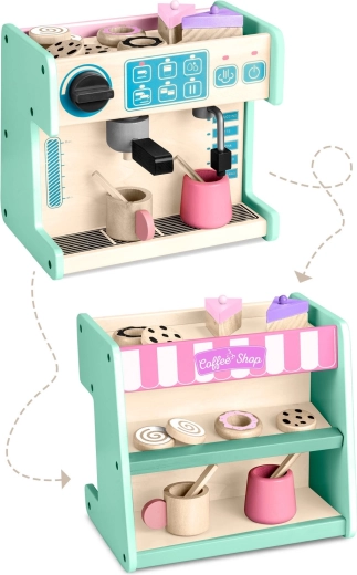 Questa caffetteria in legno con macchina espresso nel popolare design color menta unisce due giochi in uno — coffee bar e pasticceria. I bambini possono “preparare” espresso, cappuccino o latte e allo stesso tempo servire dolcetti in legno su un elegante espositore. Grazie alle dimensioni compatte, il set è adatto anche ai viaggi ed è facile da riporre.