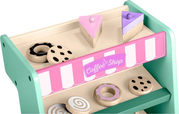 Un elegante espositore e ripiani per servire donut, biscotti e pasticcini in legno stimolano la fantasia e il gioco di ruolo della caffetteria.