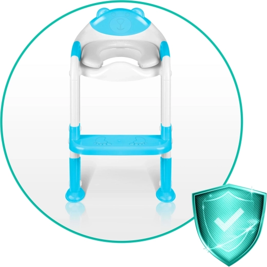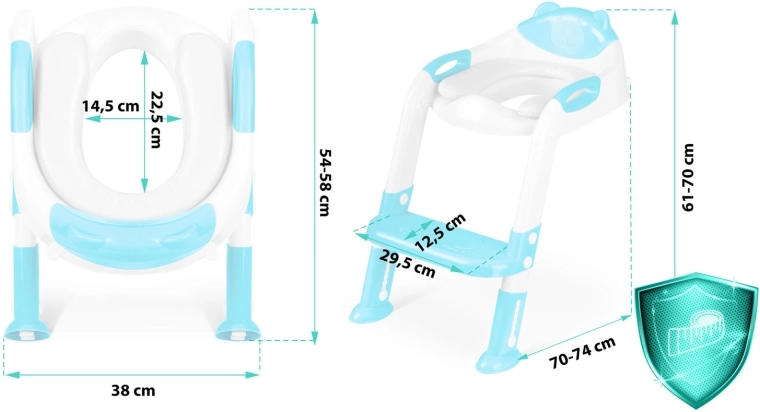 Per sicurezza e comfort, la seduta è dotata di piedini e gradino antiscivolo, schienale dal profilo ergonomico e imbottitura morbida removibile per un’igiene agevole. L’altezza regolabile garantisce compatibilità con la maggior parte dei WC standard e una seduta stabile per il bambino.