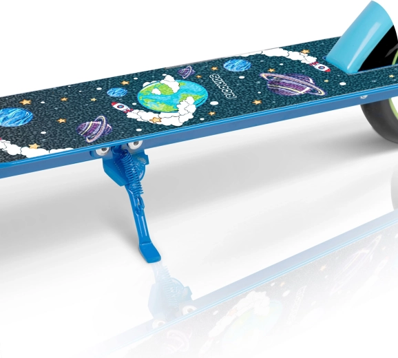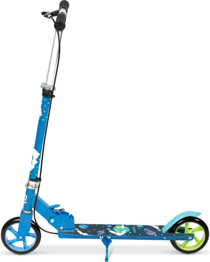 Monopattino leggero e resistente per bambini 3–8 anni con elegante design spaziale, dotato di struttura pieghevole, manubrio regolabile, grandi ruote in PU da 145 mm e doppio sistema di frenata sicuro – manuale e a pedale. La guida fluida e silenziosa è garantita dai cuscinetti ABEC-7, mentre la stabilità è assicurata dall’ampia pedana antiscivolo e dal telaio robusto con certificazione EN 71.