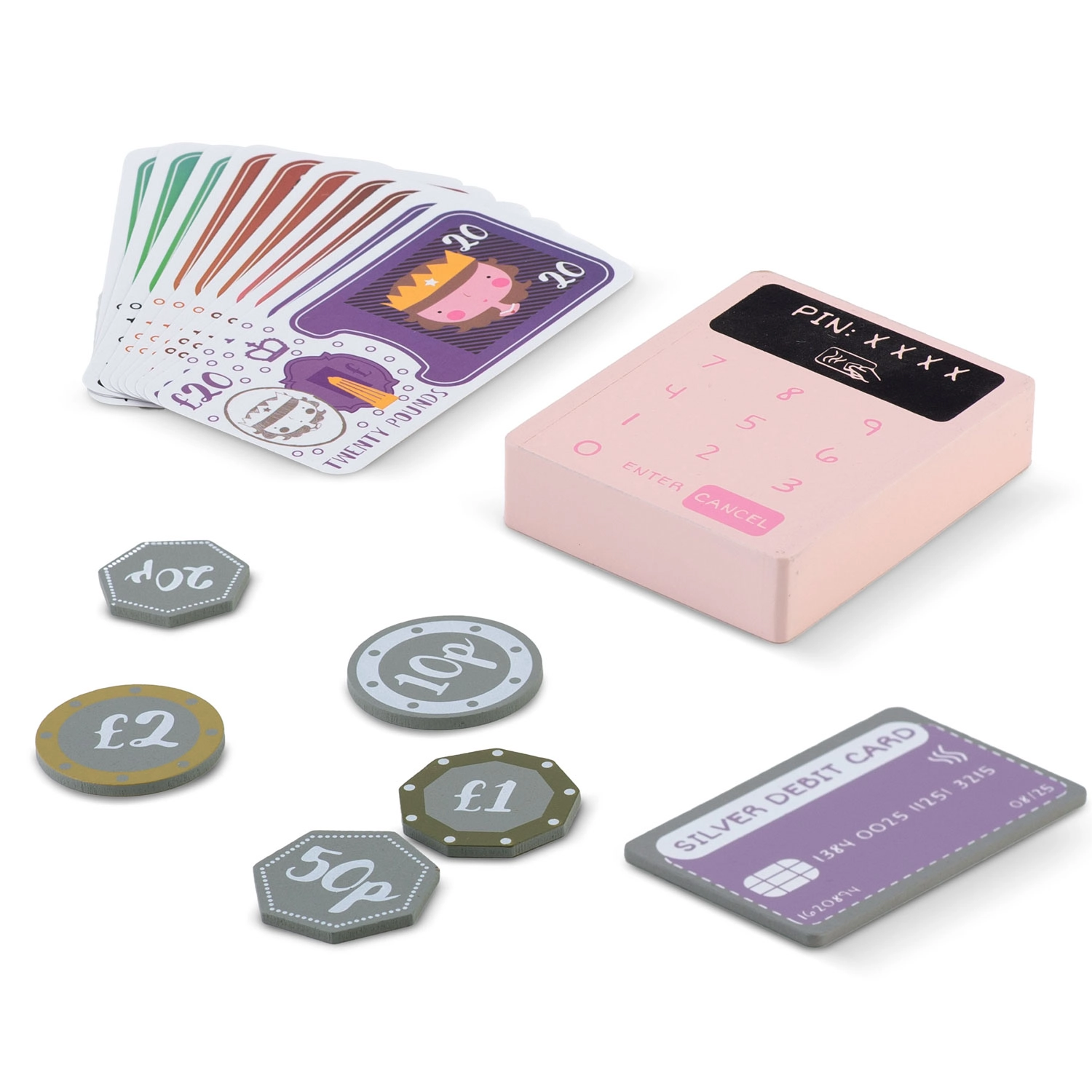 - Ricco set di accessori: carta di pagamento, 10 banconote e 5 monete.
