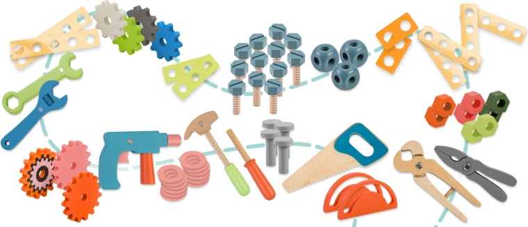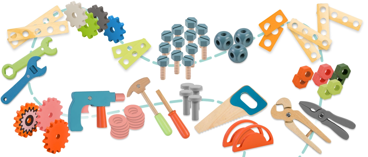 Questo banco in legno con un’ampia dotazione di strumenti offre ai bambini una vera mini officina. Grazie agli ingranaggi girevoli, alla morsa funzionante e alle numerose viti e dadi, i piccoli artigiani imparano a stringere, avvitare e assemblare semplici strutture. Spazi di archiviazione studiati e pannello forato mantengono tutti i pezzi a portata di mano.