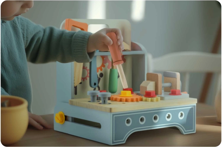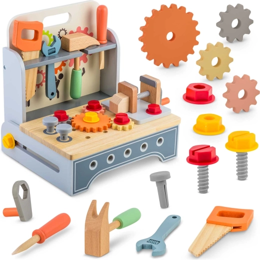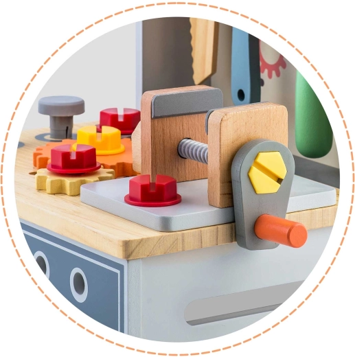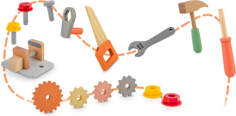 Una mini morsa funzionante e un set di viti e dadi permettono ai bambini di fissare pezzi, stringere e costruire le proprie strutture.