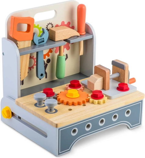Il banco da lavoro in legno per bambini RICOKIDS offre tante opportunità di scoperta e gioco. I piccoli artigiani possono avvitare, stringere, segare e serrare nella morsa funzionante, girare i meccanismi collegati e riporre gli strumenti sulla pratica tavola con sagome. Legno di qualità, bordi lisci e colori sicuri garantiscono durata e sicurezza nell’uso quotidiano.