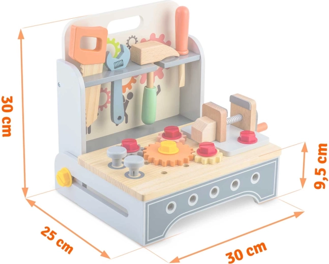 Martelletto, cacciavite, chiave e seghetto hanno il loro posto sul pannello e sulla mensola. Struttura sicura e resistente, ideale per le piccole mani.
