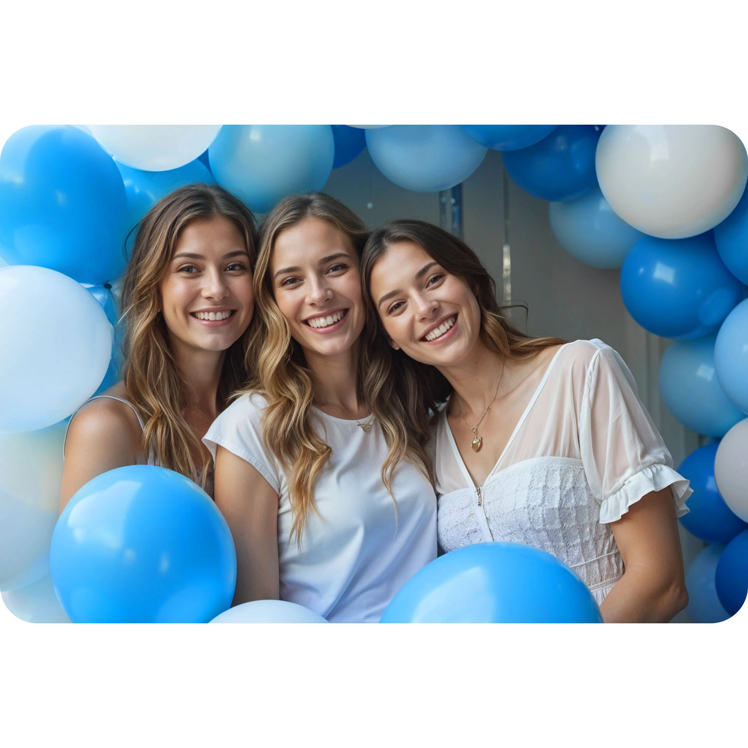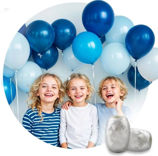 Nella confezione trovi tutto il necessario: 30 palloncini in lattice in bianco, blu chiaro e blu scuro e 40 metri di nastro decorativo argentato per legare o creare ghirlande. Il set è ideale per compleanni, matrimoni, baby shower, feste per bambini e photobooth a tema.