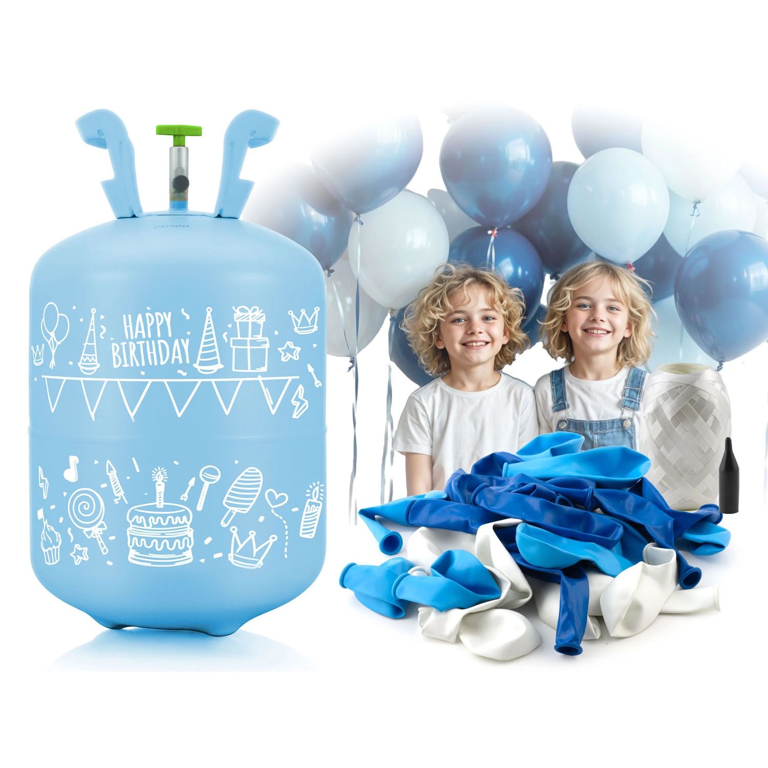 Set festa completo per un allestimento facile: bombola di elio 0,20 m³ con mini riduttore, 30 palloncini in bianco e tonalità di blu e 40 m di nastro decorativo. La bombola monouso e portatile è conforme alle norme EN71 e CE e basta per circa 30 palloncini di diametro ~23 cm – ideale per compleanni, matrimoni, baby shower e feste per bambini.