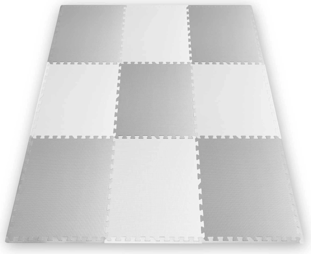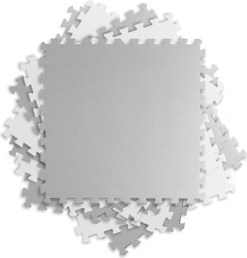 Grazie ai bordi a puzzle, il tappetino può essere facilmente ampliato, assemblato in forme diverse e trasformato in una elegante scacchiera bianco-grigia. La superficie è antiscivolo per un movimento sicuro dei bambini e la manutenzione è estremamente semplice: basta passare con un panno umido. Il tappetino è adatto anche agli allergici, poiché non assorbe polvere né acari.