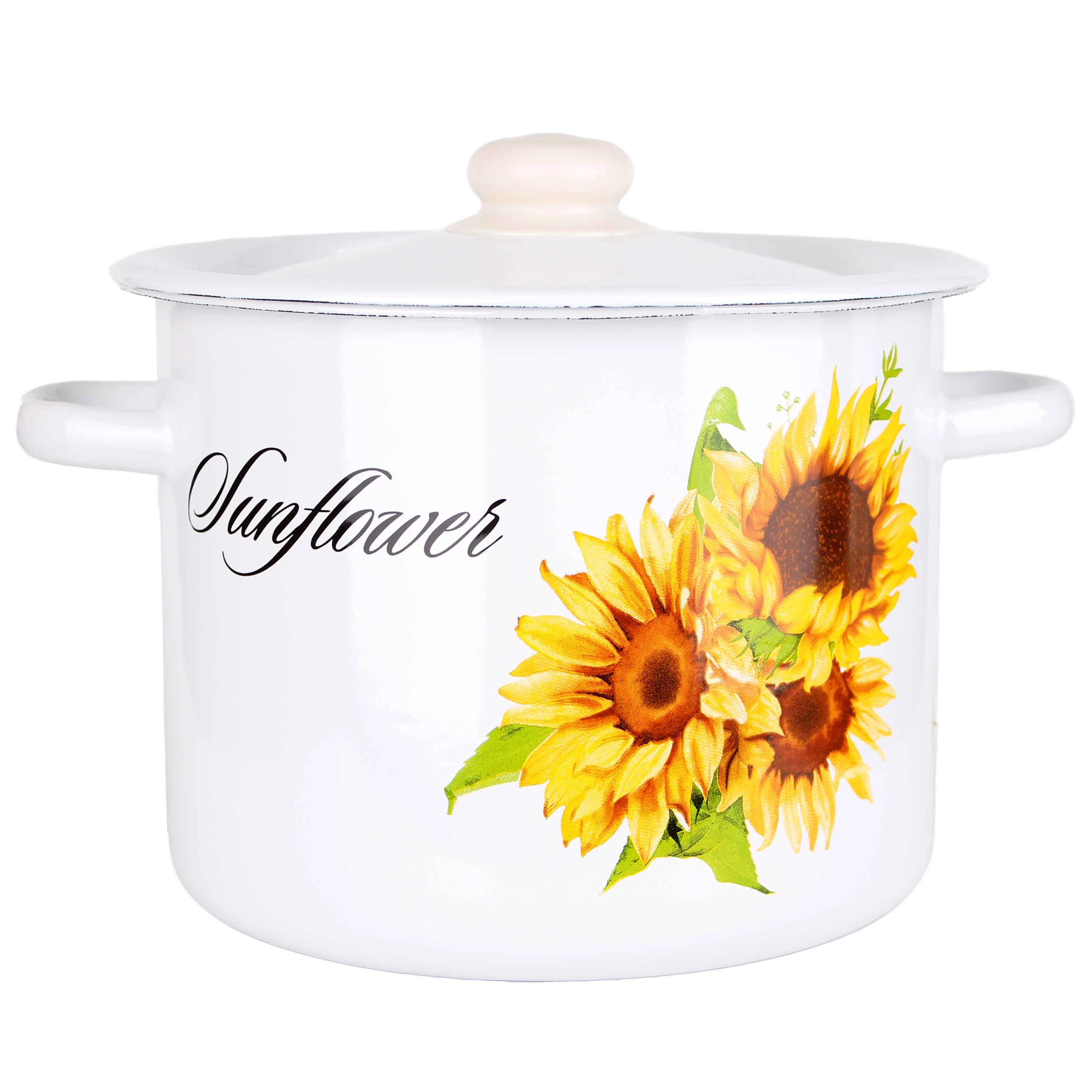 Pratica e resistente pentola smaltata con coperchio da 5,5 l nel decoro Girasole, ideale per la cucina di tutti i giorni. Offre una distribuzione uniforme del calore, manutenzione semplice e lunga durata grazie allo smalto di alta qualità.