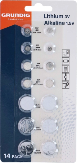 Il set universale di batterie a bottone GRUNDIG offre 14 pezzi dei tipi più utilizzati AG e CR per orologi, calcolatrici, telecomandi, torce LED e altra piccola elettronica. Prestazioni affidabili, lunga durata e ampia compatibilità in un’unica confezione pratica.