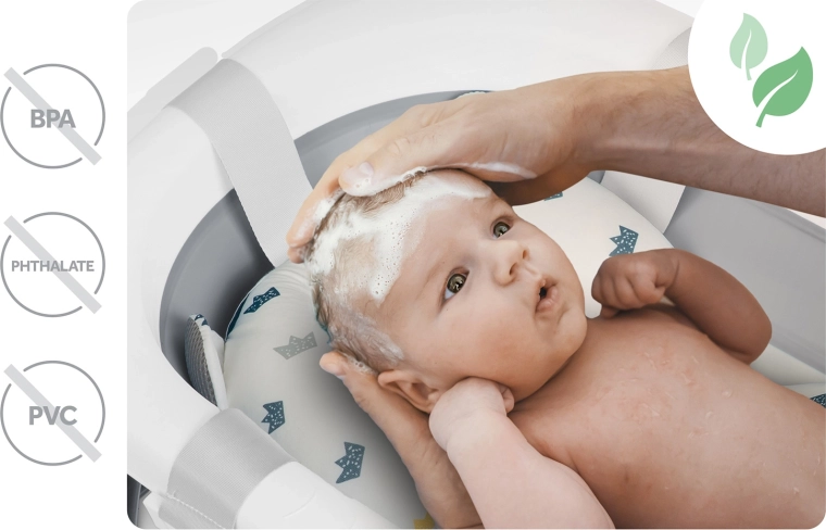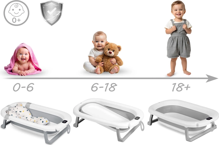La vaschetta è progettata per adattarsi alla crescita del bambino: con inserto 0–6 mesi per un bagnetto in posizione sdraiata sicura, 6–18 mesi senza inserto per i primi seduti autonomi e da 18 mesi in su per più spazio di gioco. Rispetta le norme di sicurezza europee, è priva di BPA e offre lunga durata e utilizzi versatili in casa.