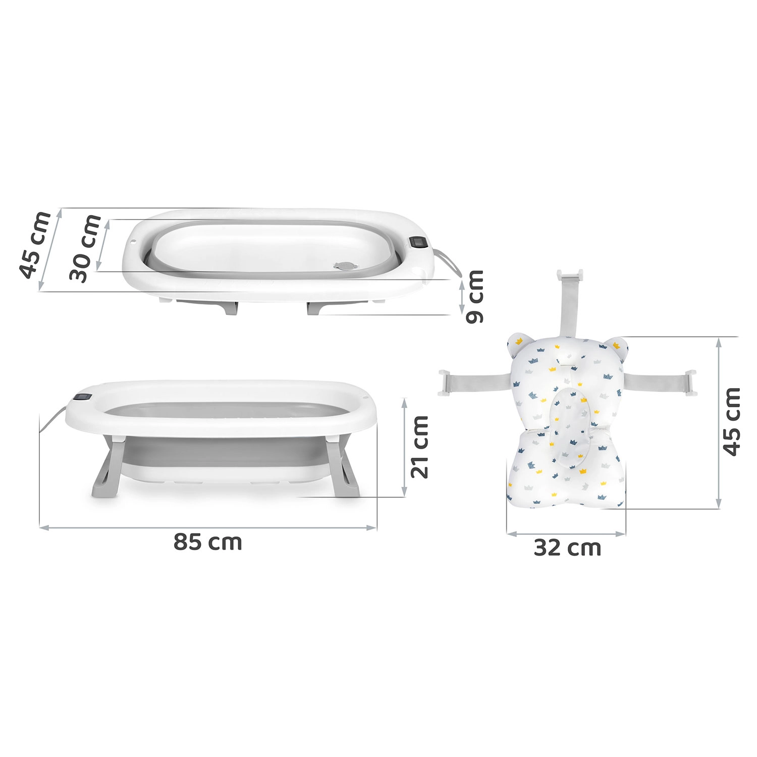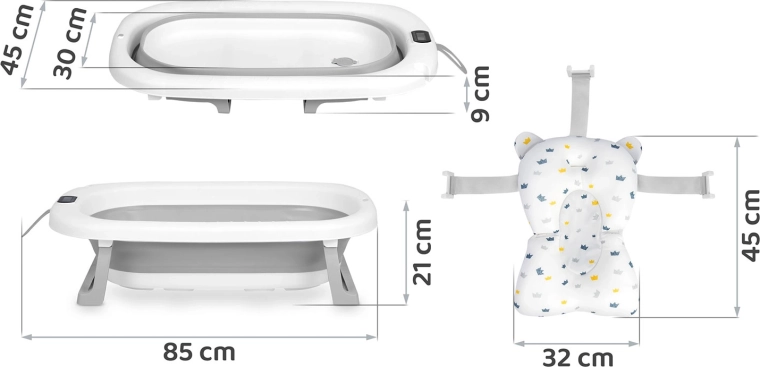 La struttura pieghevole con gambe stabili richiudibili e pattini antiscivolo garantisce sicurezza anche su superfici scivolose. Grazie alle dimensioni compatte da chiusa la vaschetta si ripone facilmente o si porta in viaggio. Il pratico supporto per la doccetta facilita il riempimento senza schizzi e il fondo con scarico accelera lo svuotamento.