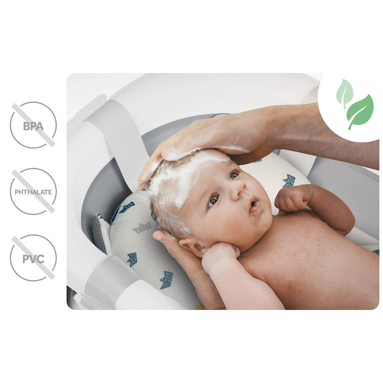 L’inserto imbottito e ad asciugatura rapida con cinghie regolabili si fissa in modo sicuro ai bordi della vaschetta. Sostiene testa e schiena, aumentando comfort e sicurezza.