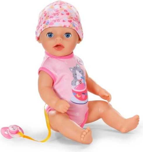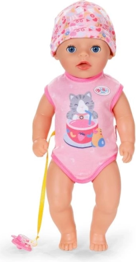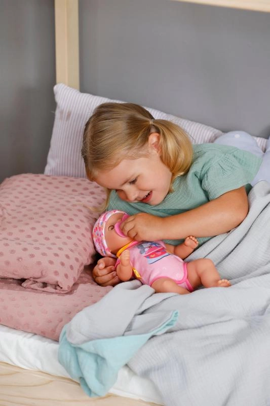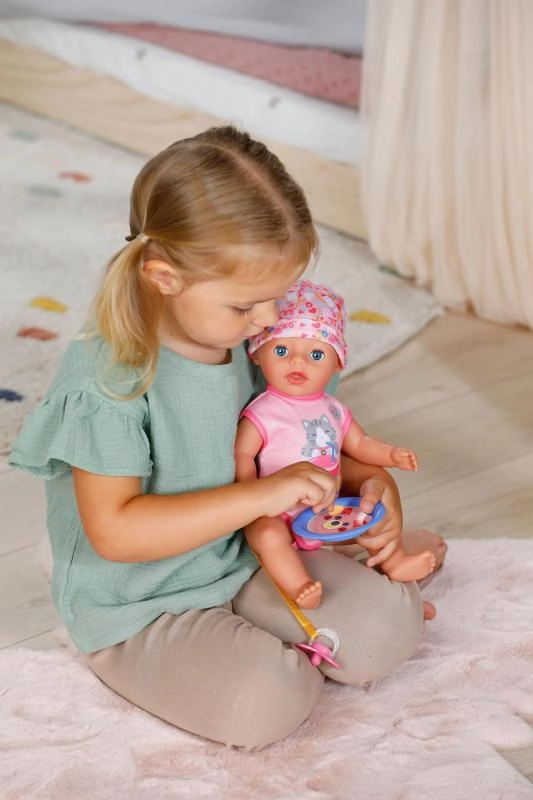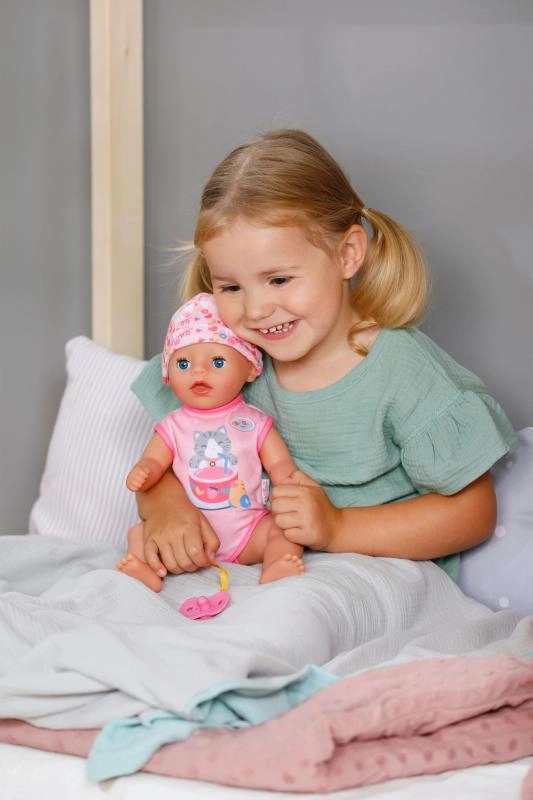 Il ciuccio fissato alla tutina con un tenero motivo di gattino permette alla bambola di aprire e chiudere gli occhi anche da seduta. Quando viene messa nella culla, chiude gli occhi da sola, come se si addormentasse davvero. Braccia e gambe mobili e testa girevole rendono più facile vestire e svestire, così i piccoli caregiver possono fare tutto da soli.