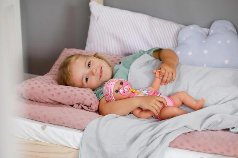 La bambola apre e chiude gli occhi con l’aiuto del ciuccio in dotazione e, quando viene messa nella culletta, li chiude da sola. Un ottimo effetto per rituali rilassanti della buonanotte.