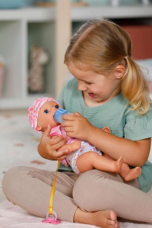 La dolce bambola BABY born Lena 36 cm è la prima bambola ideale per bambini da 1 anno. Ha arti snodabili, apre e chiude gli occhi magicamente con o senza ciuccio e sa bere dal biberon, fare pipì nel pannolino o usare il vasino. Funziona senza batterie e, grazie alle dimensioni compatte, è perfetta da tenere nelle manine piccole.