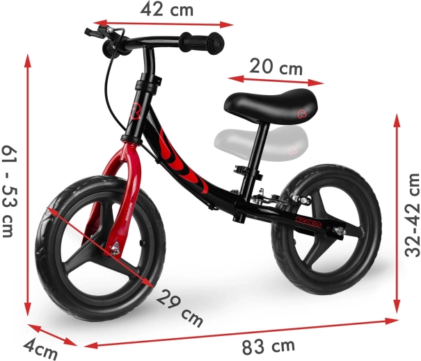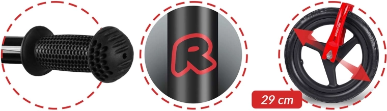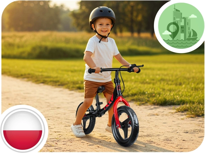 Design polacco curato nei dettagli e conforme agli standard di sicurezza europei. Le manopole antiscivolo con terminali assicurano una presa salda, mentre la sella ergonomica con regolazione continua in altezza si adatta alla crescita del bambino. Il freno posteriore facilita un arresto sicuro e aumenta il controllo durante la guida.