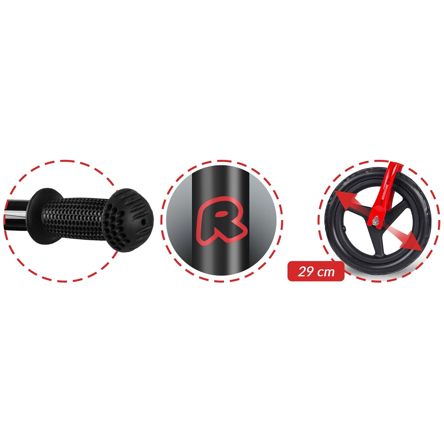 - Ruote in EVA da 29 cm antiforatura – resistenti a umidità, raggi UV e basse temperature, facili da pulire.