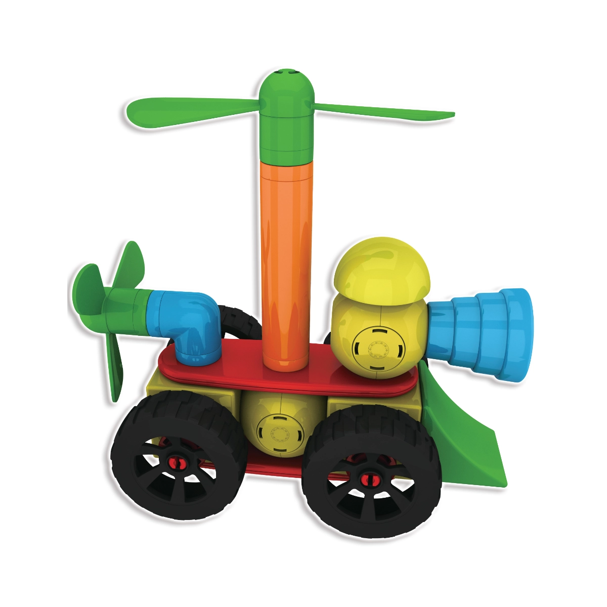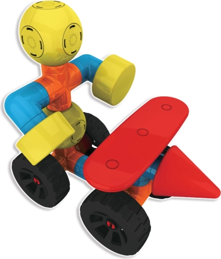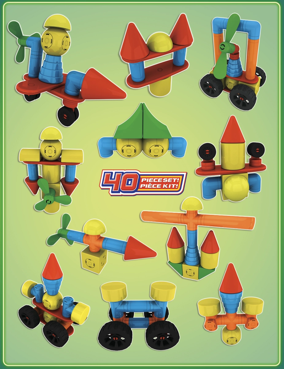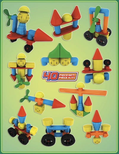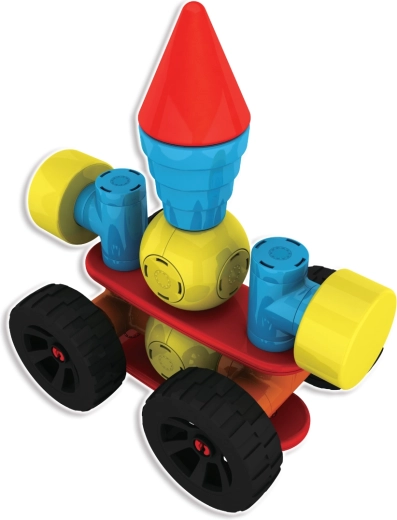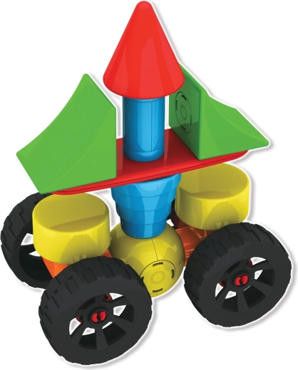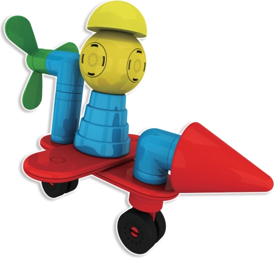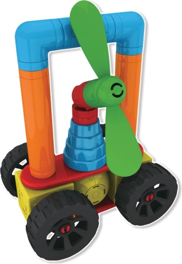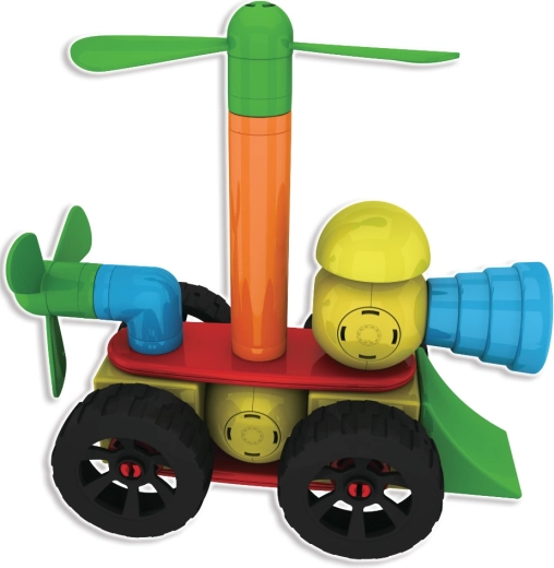 Ruote ed eliche trasformano le costruzioni in veicoli dinamici e macchine volanti. I bambini possono ricostruire continuamente e scoprire nuove combinazioni che sviluppano creatività e logica.