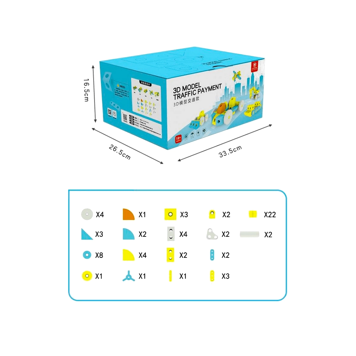 - Ruote, triangoli, quadrati, elementi distanziatori, connettori in plastica, istruzioni