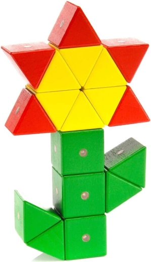 Ogni pezzo è realizzato in legno di faggio accuratamente selezionato con spigoli arrotondati e superficie liscia. I magneti integrati sono alloggiati in modo sicuro, così le costruzioni reggono saldamente e il gioco è sicuro. Grazie a 7 forme e 5 colori vivaci, i bambini passano da semplici composizioni a schemi avanzati fino a modelli elaborati seguendo le ispirazioni incluse.