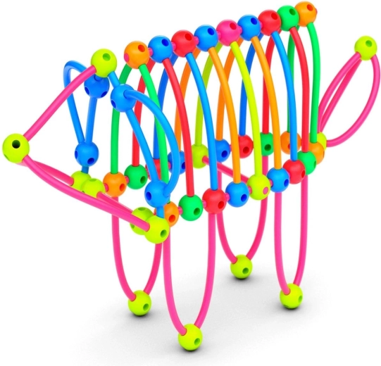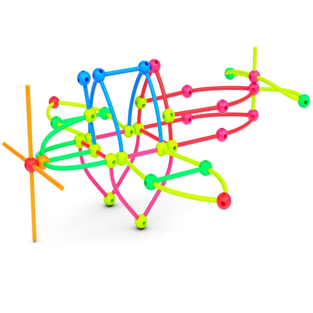 Aste neon flessibili e perline a scatto si collegano in strutture tridimensionali che sviluppano creatività e motricità fine.