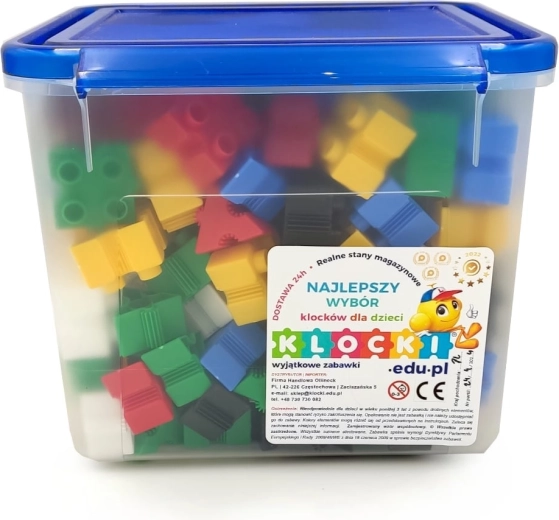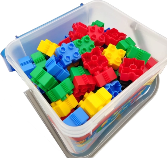 Il set è contenuto in una resistente scatola di plastica con coperchio e manico per un comodo trasporto. Inclusa una chiara istruzione in formato A4 per facilitare le prime costruzioni. I materiali rispettano le norme europee di sicurezza (CE) e sono adatti all’uso quotidiano a scuola e a casa.